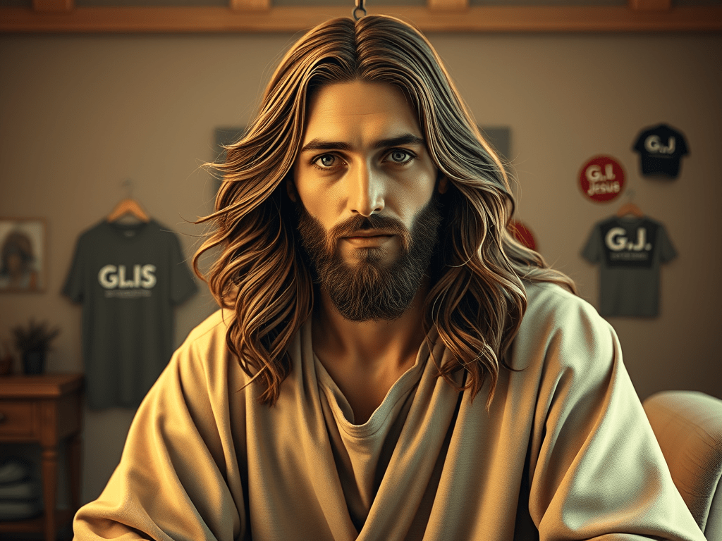 There’s a version of Jesus Christ walking around America right now that the original would probably not recognize. He’s on t-shirts. He’s on truck decals. He’s in dining rooms in a soft-lit portrait that makes him look like he’s about to ask you to prom. He’s been on cable news, at political rallies, and somehow, inexplicably, at monster truck shows.